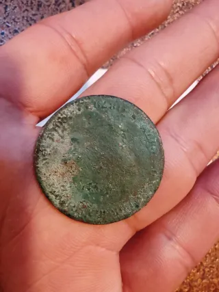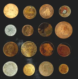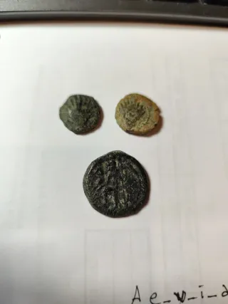 Monete antiche con patina verde. - Materiale: Metallo (probabilmente bronzo o rame). - Design: Incisi sbiaditi dal tempo.