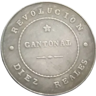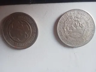 Due monete antiche, ideali per collezionisti. Una moneta con design a scudo e testo in tedesco. Un'altra moneta con l'aquila messicana e il valore di 5 pesos.