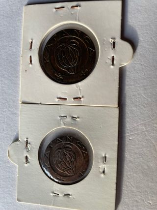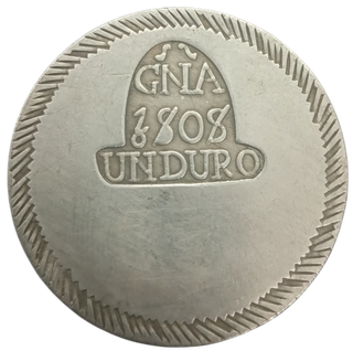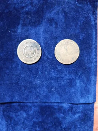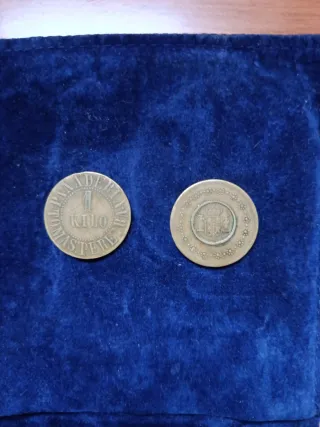 Set di due monete antiche, una delle quali con l'iscrizione 1 KILO PANETTERIA TOMAS PEREIRA. - Moneta con iscrizione 1 KILO PANETTERIA TOMAS PEREIRA. - Seconda moneta con design a scudo.