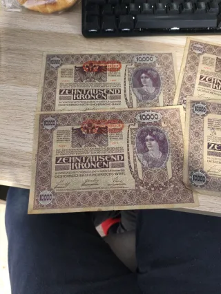 Pack di 21 banconote antiche. Banconote di Spagna (Guerra Civile, dopoguerra, anni 50-70: 5, 25 e 100 pesetas), Austria/Impero Austro-Ungarico (10.000 Kronen resellate), Germania iperinflazione (10.000 Mark 1922), Italia (500 e 1.000 lire), Marocco (epoca coloniale), Cina (banconota antica), Vietnam (banconote antiche e moderne), Australia (10 dollari, in corso), Singapore (20 dollari, in corso), Romania (10 lei, in corso). Grande varietà di paesi ed epoche. Banconote originali, la maggior parte circolate, con usura evidente, pieghe o segni (vedi foto). Si vende il lotto completo, non separabile.