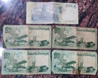 Lot di banconote antiche, tra cui una argentina e quattro portoghesi. - Banconota da 1 Peso Argentino. - Quattro banconote da 20 Escudi Portoghesi. - Banconote di diverse serie e numeri di controllo. #numismatica #banconote #banconoteantiche #collezionismo