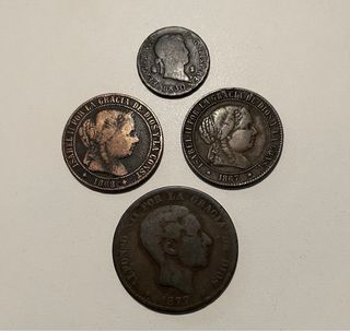 Set di quattro monete antiche spagnole. Include due monete da 2 centesimi di scudo e una da dieci centesimi. - 1867 e 1868 con l'iscrizione REINA DE LAS ESPAÑAS 2½ CENTIMOS DE ESCUDO. - Una moneta con l'iscrizione REY CONST. DE ESPAÑAS DIEZ CENTIMOS. 1877 - 2 maravedì 1830