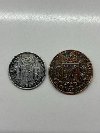 Set di due monete antiche, una di Alfonso XIII e l'altra di Isabella II. - Moneta di Alfonso XIII con data 1900. - Moneta di Isabella II con data 1869. - Iscrizioni in spagnolo.