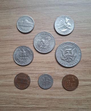 Lotto di 12 monete antiche degli Stati Uniti e del Canada, provenienti da collezione privata. Include: 1. Stati Uniti (8 monete) - 1 Dollar Eisenhower - 1⁄2 Dollar Kennedy - 2 Quarter Dollar - 1 Dime - 5 cents - 2 One Cent 2. Canada - 1 Dollar “Loonie” - 1 Quarter dollar - 10 cent - One Cent Monete autentiche, circolate e ben conservate in cartoncini per anni. Si consegnano esattamente le monete che appaiono nelle foto (anverso e reverso). Materiale cupro-nickel / ottone