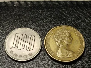 In vendita lotto di due monete antiche. - Una moneta del Giappone con design floreale. - Una moneta australiana da 1 Dollaro con canguri.