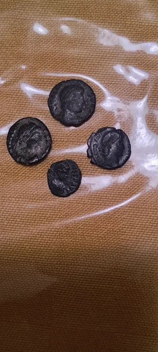 Set di quattro monete antiche romane. Ogni moneta presenta un profilo. - Quattro monete incluse. - Dettagli del profilo visibili.