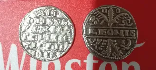 Set di due antiche monete commemorative con incisioni dettagliate. Una moneta presenta iscrizioni su più righe. L'altra moneta ha la parola LEONIS al centro e motivi decorativi.