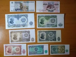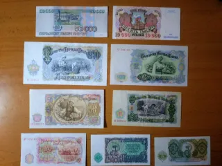 Raccolta di banconote antiche della Russia e della Bulgaria. - Banconota da 50.000 rubli della Russia. - Banconota da 10.000 rubli della Russia. - Banconote da 200, 100, 50, 25, 10, 5 e 3 leva della Bulgaria. Varie qualità.