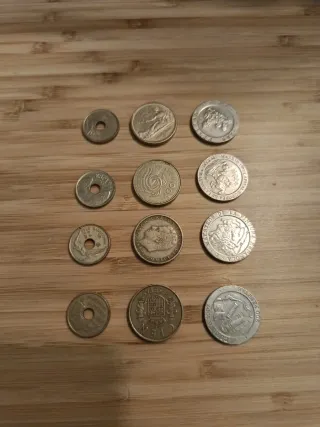 Lotteria di 12 monete antiche in peseta spagnola. Include 4 monete da 25, 100 e 200 peseta. Pezzi da collezione per numismatici.
