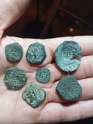 Raccolta di monete antiche di origine spagnola, con incisioni storiche. - Monete in metallo con dettagli di stemmi e numeri romani. - Varietà di dimensioni e forme. - Pezzi con patina di antichità.