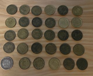 NEGOCIABLE Collezione di monete antiche Pesetas. Alcune monete presentano incisioni dettagliate. - Varietà di dimensioni e design. - Monete di diversi anni.
