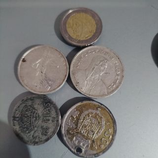 Collezione di varie monete antiche, ognuna con il proprio design e valore storico. - Moneta da 50 pesetas. - Moneta di Carlo I Re di Spagna 1957. - Moneta di Juan Carlos I Re di Spagna 1980. - Moneta con profilo di regina. - Moneta con stemma di Spagna.