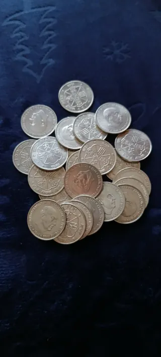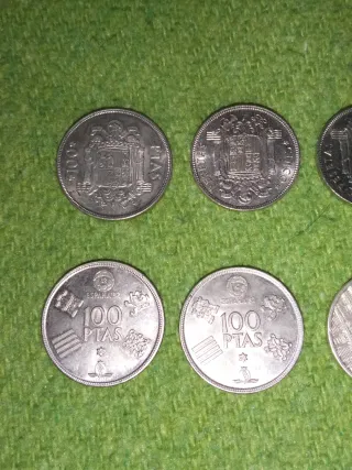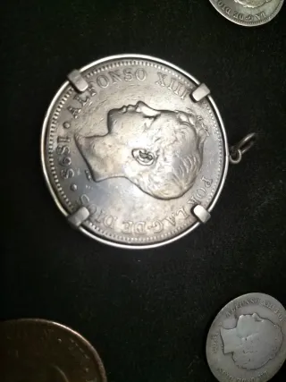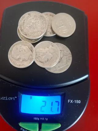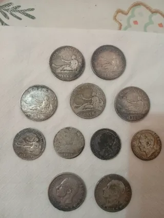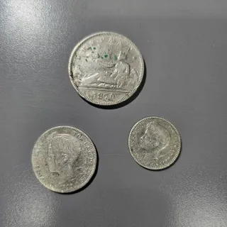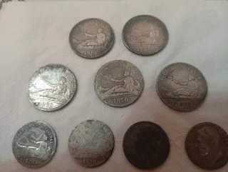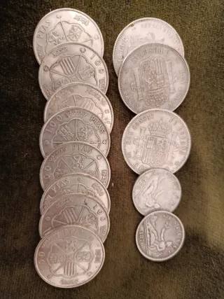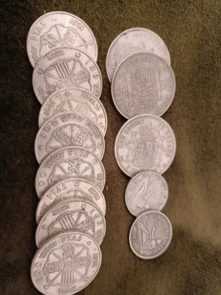 Vendo lotto di argento composto da 8 monete da 100 del 1966 con stelle perfette, 3 duro d'argento Alfonso XII e XIII anche con stelle visibili e 2 da due pt del 1870 anche con stelle visibili. Prezzo per unità da 100 pt: 20€, per unità duro: 25€, per unità da 2 pt: 8€. Prezzo del lotto: 250€.