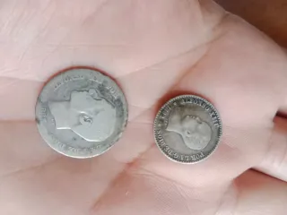 Set di due monete d'argento, una dell'anno 1891 di Alfonso XIII e l'altra del 1871 di Amadeo I re, entrambe in argento