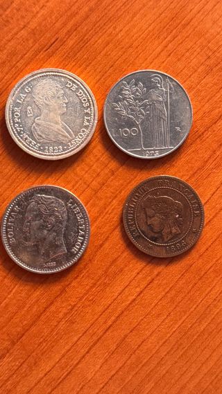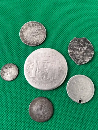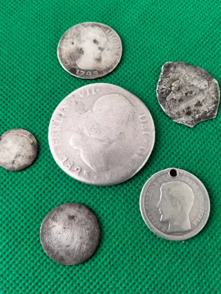 Set di diverse monete antiche, alcune in argento, con diversi disegni e date. - monete datate 1793. - monete con la scritta FERDINANDO VII e datate 1823. - Moneda con profilo a forma di re e foro. - Moneta irregolare. - Moneda con motivo a forma di uccello.