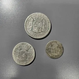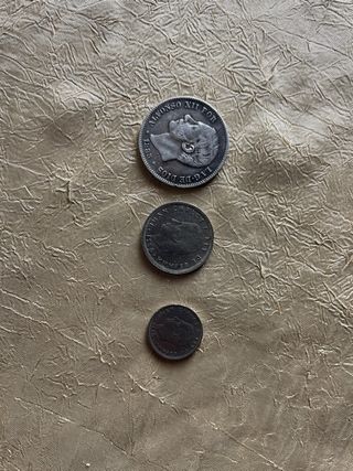 Set di tre monete antiche, ognuna con un design distintivo. - Moneda con un ritratto di Alfonso XII e l'anno 1883. - Moneda con ritratto di Juan Carlos I. - Piccole monete con disegno inciso. Uno è d'argento