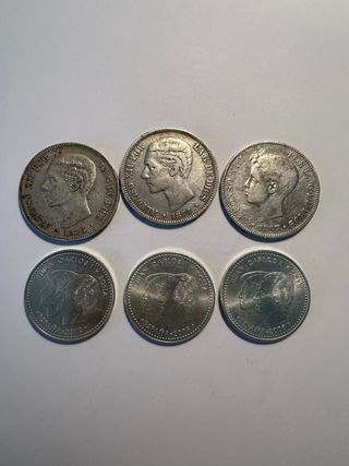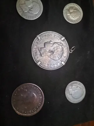 Set di cinque monete antiche, composte da 4 in argento e una in lega di rame.2 di Alfonso XIII, altre 2 di Alfonso XIII e una di Ferdinando VII. - Moneda centrale con Alfonso XIII 1898 - Moneda inferiore con Alfonso XIII - Tre monete aggiuntive con ritratti e leggende.