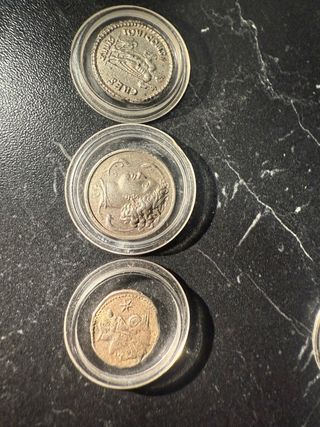 Set di monete antiche e da collezione. - Una moneta commemorativa di Paperino. - Una moneta con foro centrale da 25 pesetas. - Una moneta d'argento. - Una moneta di bronzo.