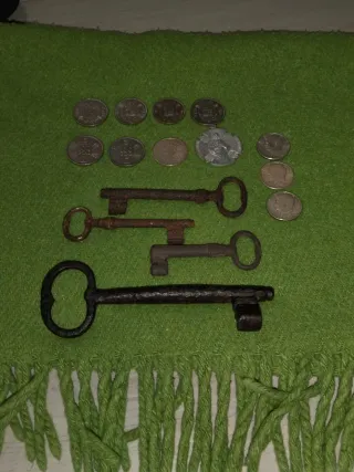 Set di oggetti d'antiquariato che include varie chiavi e monete. Alcune in argento. Quattro chiavi di metallo di diverse dimensioni e stili. Varietà di monete.