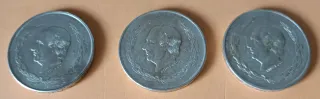 Raccolta di varie monete antiche, alcune con iscrizioni e dettagli storici. - Moneta di rame con stemma. - Moneta d'argento con ritratto. - Moneta di bronzo con incisione. - Moneta del valore di 50.
