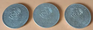 Set di tre monete antiche con un profilo incisi. 5 Pesos d'argento Messico 1951-52-53. 27,5 gr d'argento 0,720 per moneta. - Design con rami di alloro. - Iscrizione HIDALGO visibile su una di esse.
