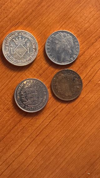Set di quattro monete antiche di diversi paesi ed epoche. - Moneta con scudo e corona. - Moneta con profilo di donna e REPUBBLICA ITALIANA. - Moneta del Venezuela DUE BOLIVARES 1990. - Moneta con corona d'alloro e FRATERNITE. - Materiali vari, tra cui argento e bronzo.
