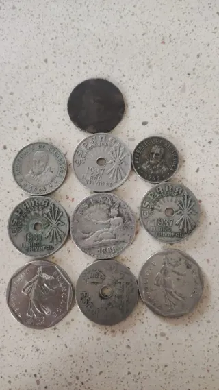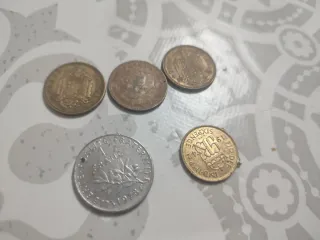 Set di cinque monete antiche di diversi anni della Francia. - Una moneta con Commerce Industrie e l'anno 1923. - Una moneta con il profilo di una donna e Republique Francaise. - Una moneta d'argento con il profilo di una donna e Republique Francaise. - Due monete piccole con RF e un buco al centro.