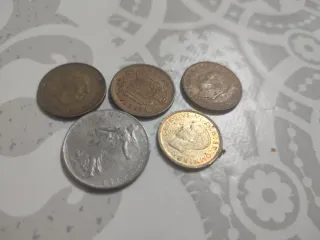 Monete antiche pesetas per collezionisti. - Moneta d'argento con iscrizione 1 Franc 1974. - Moneta dorata con iscrizione SIX PENCE 1942. - Due monete dorate con stemmi. - Una moneta argentata con stemma.