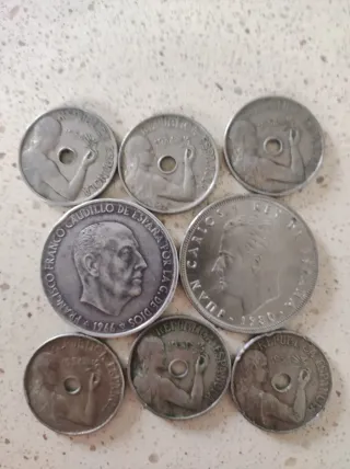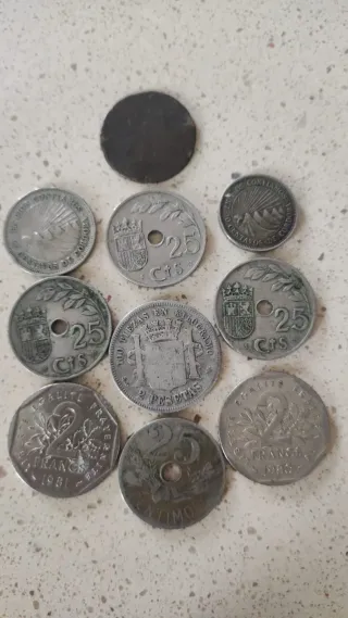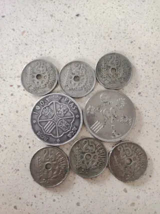 Set di monete antiche, ideale per collezionisti. Include una moneta d'argento da 100 pesetas e diverse monete da 25 centesimi.