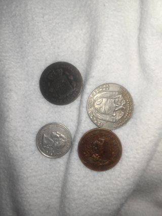 Set di quattro monete antiche di diverse origini ed epoche. 50 euro per tutte e 4. Nessuna spedizione, consegna a Las Pajanosas, Guillena senza costi aggiuntivi o Plaza de Armas, Siviglia con 5 euro extra. - Una moneta d'argento con scudo. - Una moneta di bronzo con scudo e legenda. - Una moneta di bronzo con aquila. - Una moneta degli Stati Uniti d'America.