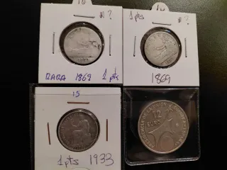 Lote di 4 monete antiche, due di esse in argento con data del 1869 e una del 1933. - Moneta del 1869 (Spagna) - Moneta del 1869 (Spagna) - Moneta del 1933 (Spagna) - Moneta da 12 Euro (Presidenza dell'Unione Europea Spagna)