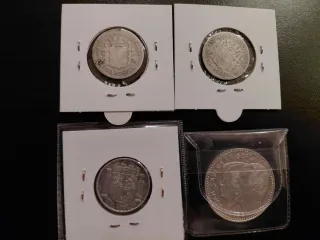 Set di quattro antiche monete d'argento dalla Spagna. Con design a stemma. Valore di 50 centesimi.
