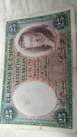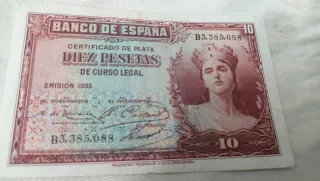 2 Banconote del Banco de España da 100 pesetas ciascuna, emesse il 15 agosto 1928. 5 Banconote del Banco de España da 50 pesetas ciascuna, emesse il 22 luglio 1935. 1 Banconota del Banco de España da 50 pesetas, emessa il 25 aprile 1931. 1 Banconota del Banco de España da 25 pesetas, emessa il 25 aprile 1931. 4 Banconote del Banco de España, certificato d'argento, da 10 pesetas ciascuna, emissione del 1935. 3 Banconote del Banco de España, certificato d'argento, da 5 pesetas ciascuna, emissione del 1935. Presentano ritratti e motivi decorativi. Firma del Governatore, dell'Interventore e del Cassiere.