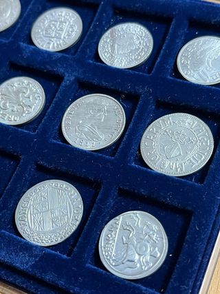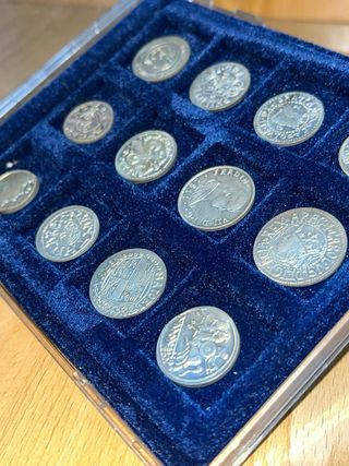 Set di 12 antiche monete d'argento di Valencia, presentate in un'espositore. Dettagli scolpiti in ogni moneta. Scatola rivestita in velluto blu. Collaborazione tra Las Provincias e la Banca di Valencia.