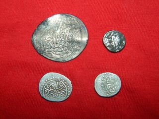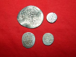Set di quattro antiche monete d'argento di origine araba medievale da identificare con pesi che vanno dai 2 grammi la più grande a 1,1 grammi, 0,7 grammi e 0,8 grammi. Materiale: Argento. Epoca: Medievale. Provenienza: Araba.