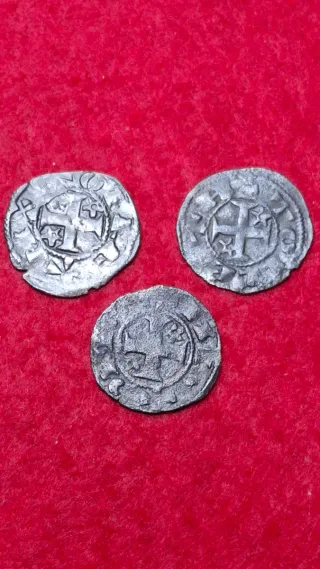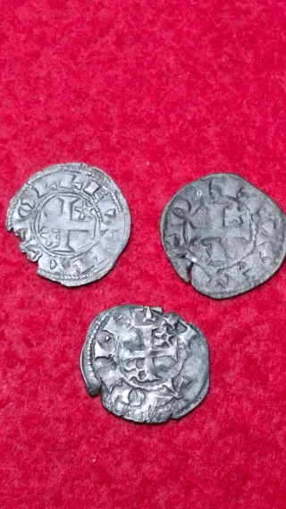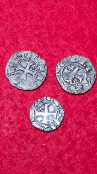 Set di tre antiche monete di Alfonso VIII, attribuite anche ad Alfonso I d'Aragona. - Monete d'argento. - Design con croce. - Pezzi storici.