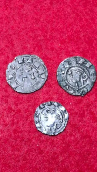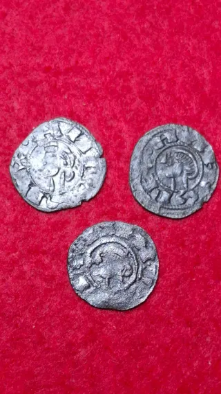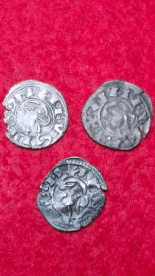 Set di tre antiche monete, dineros di Alfonso VIII. Pezzi storici con dettagli di croce, anche attributi ad Alfonso I d'Aragona. - Tre (3) dineros di Alfonso VIII. - Design con croce centrale. - Monete d'argento.