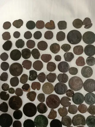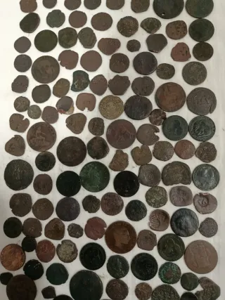 Lote di 55 monete di tutte le epoche, perfette per la pulizia e la classificazione. Il lotto può contenere monete romane, iberiche, medievali, maravedì, riselli, arabe, ases, sesterzi, bianche, bilioni, bronzi, antoniniani