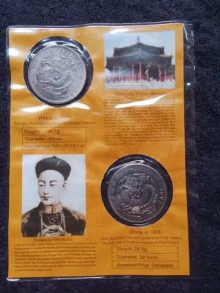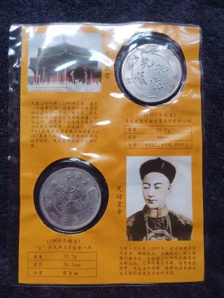 Cina Riconio Ufficiale di 2 Antiche Monete Cinesi come meglio in Descrizione. Moneta della dinastia Quingun dollaro "Kuang-hsu" (o Guangxu) emesso intorno al 1908. Il testo sulla moneta indica "KWANG-SHU" e la denominazione "ONE TAEL" o "ONE YUAN", a seconda dello specifico conio provinciale. Moneta dollaro cinese ("Tael" o "Dollar"). Periodo: Dinastia Qing, tipicamente emessa durante il regno dell'imperatore Guangxu (1875-1908).