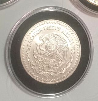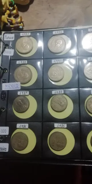 Collezione di monete messicane di diversi anni. - Monete in argento e altri metalli. - Include anni come 1970, 1973, 1984, 1985, 1986, 1988, 1990. - Alcune monete hanno dettagli incisi dell'aquila messicana.