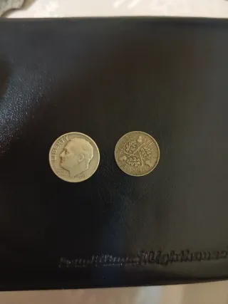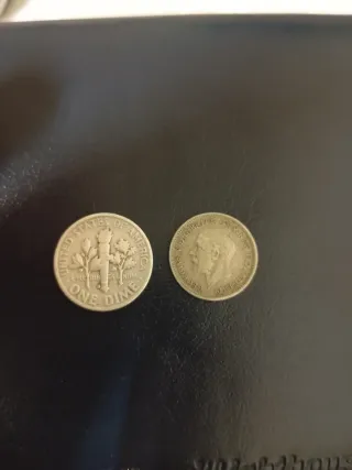Due monete d'argento, una degli Stati Uniti e l'altra del Regno Unito. - Moneta degli Stati Uniti con design dell'albero e One Dime. 1953 - Moneta del Regno Unito con profilo di re Giorgio. 1932
