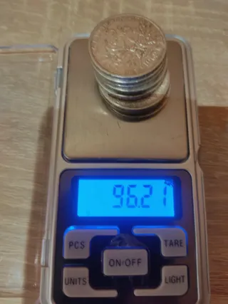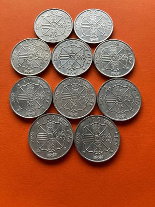 Lotto di 10 monete da 100 peseta in argento, commemorative del 1966 e con il busto di Francisco Franco. 4 stella 66, 3 stella 67, 3 stella 68. Il prezzo è inferiore al valore dell'argento, non abbassato ulteriormente. L'argento vale 1,86 al gramo, queste monete contengono 19 grammi di argento 0.800, pari a 15,2 grammi di argento puro. 15,2 x 1,86 = 28,272. Materiale: Argento. Denominazione: 100 Peseta. Dritto: Busto di Francisco Franco. Rovescio: Stemma di Spagna. Include 10 unità.