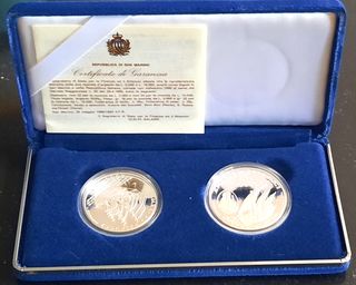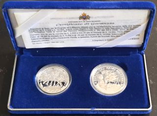 Certificato di Garanzia per due monete d'argento della Repubblica di San Marino. - Monete da 5.000 Lire e 10.000 Lire. - Materiale: Argento. - Diametro: 32 mm (5.000 L) e 34 mm (10.000 L). - Tolleranza di peso: ± 3%. - Coniazione: fondo a specchio. - Autori dei bozzetti: Bino Bini (Dritto), S. Russo-Hoyer (Verso). - Data emissione: 29 maggio 1996.