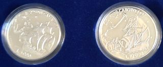 Due monete in argento con raffigurazioni di navi storiche. - Dettagli di navi a vela. - Valore nominale L. 10000. - Anno 1497.