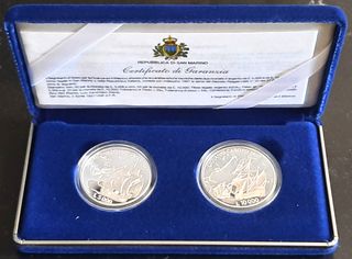 Certificato di Garanzia per due monete d'argento della Repubblica di San Marino, coniate nel 2000. - Monete in argento 835/1000. - Diametro moneta da 6.000: 32 mm. - Diametro moneta da 10.000: 34 mm. - Peso moneta da 10.000: 18 grammi. - Autori delle bozzetti: Bino Bini (Reverso) e Sandro Sansoni (Verso).