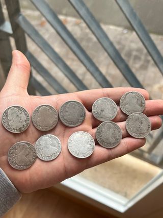 Interessante e grazioso lotto di 10 monete d'argento del valore di 2 Reales, coniate durante i regni di Carlo III e IV nelle zecche peninsulari di Madrid e Siviglia. 5 pezzi di Carlo III, 5 pezzi di Carlo IV con varie date. Possibilità di spedizione combinata con altri articoli del profilo, anche al di fuori dell'app.