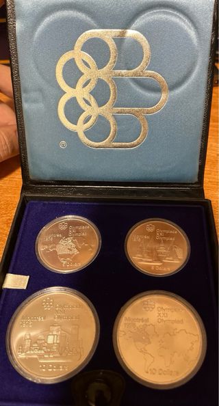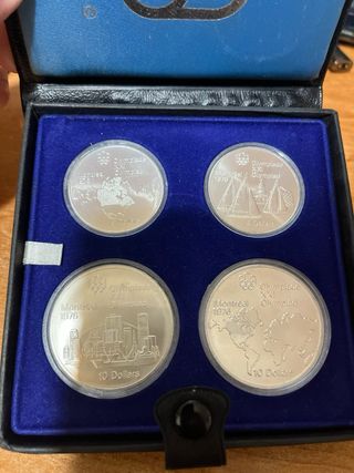 Vendo collezione privata, serie 4 monete di argento 925 commemorative Olimpiadi Monreale 1976 Si tratta di due monete da 10 dollari ( 48,6 grammi ciascuna) e due monete da 5 dollari (24,3 grammi ciascuna). Circa 145 grammi totali. Le monete sono fdc protette in custodia di plastica L’astuccio presenta qualche segno del tempo