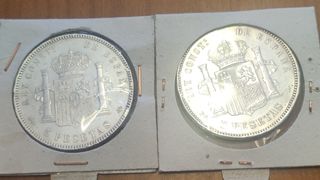 Set di due monete d'argento da 5 peseta di Alfonso XIII. - Una moneta risale al 1899. - L'altra moneta risale al 1893.