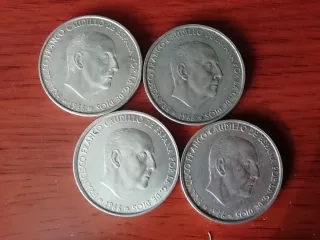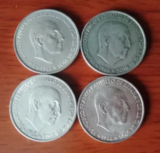 Set di quattro monete da 100 peseta dell'anno 1966. Ogni moneta ha un diametro di 24 mm, è realizzata in argento 800 e presenta il busto di Francisco Franco Caudillo di Spagna.