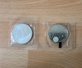 In vendita due monete commemorative da 12 euro, coniate in argento. Ogni moneta è protetta individualmente, senza essere aperta. - Moneta 1: Anno Internazionale del Pianeta Terra, Anno 2008. - Moneta 2: Presidenza dell'Unione Europea Spagna, Anno 2002.